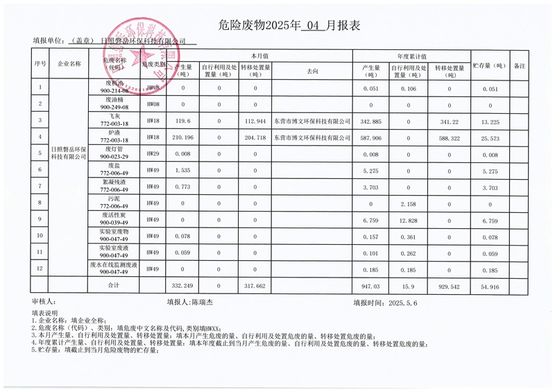 日照磐岳环保科技有限公司危险废物产生2025年4月份报表|日照磐岳环保科技有限公司-pg电子试玩平台