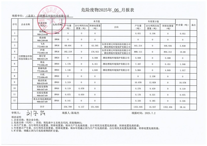 危险废物产生2025年6月份报表|日照磐岳环保科技有限公司-pg电子试玩平台